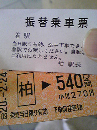 柏に着くと、駅員さんがしきりに、「振替乗車票をお持ちに方はこちらからどうぞ」と